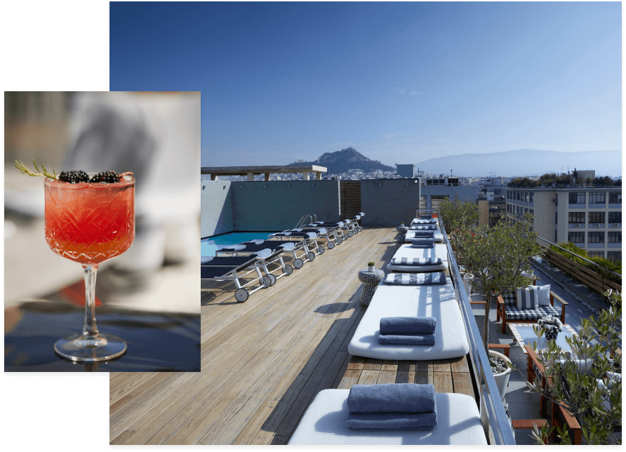 Head to our rooftop terrace for a refreshing dip in the swimming pool framed by panoramic views of the Acropolis and the city’s skyline. Relax on the sunbeds and soak up the sun while enjoying a refreshing cocktail. Watch the sunset over the city paint the sky brilliant shades of orange, red and violet.